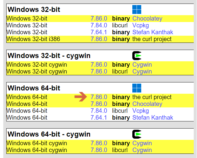 - 到 Curl 下載頁面,捲到頁面下方,選擇 Windows 32 或 64 的第一個選項。