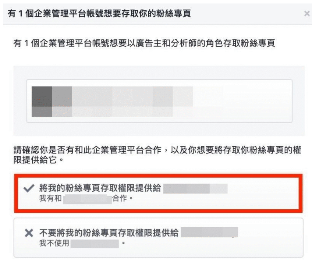 - 選擇對應開啟權限 (通常為「廣告 + 洞察報告」 或「部分管理權限(商業工具和 Facebook)」)