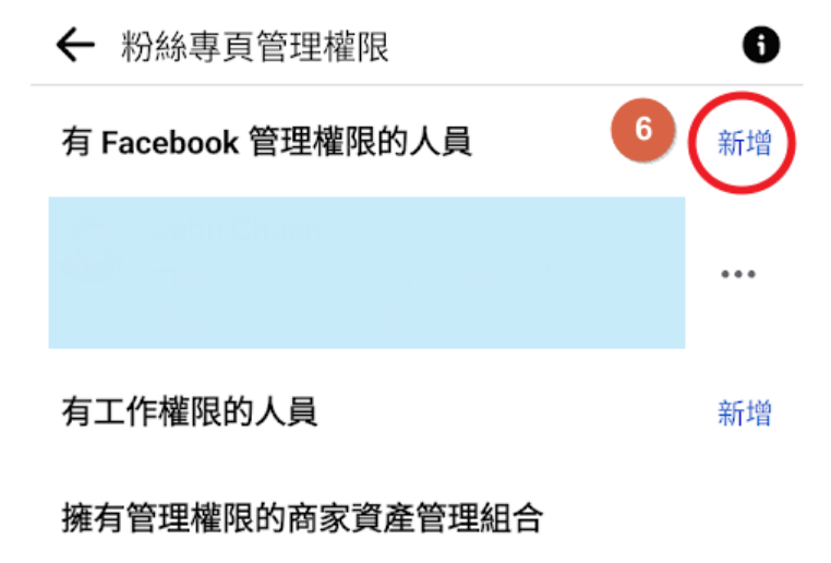 6. 點選「有Facebook管理權限的人員」> 「新增」