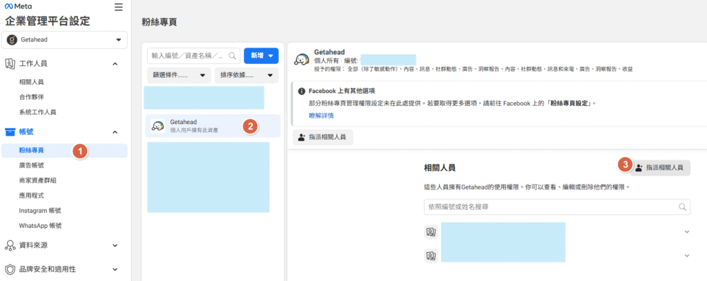4. 客戶完成加入權限後,到「粉絲專頁」> 選取粉絲專頁 > 「指派相關人員」,將自己帳號加入權限