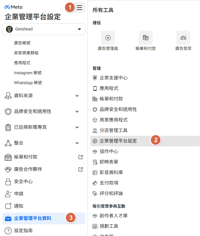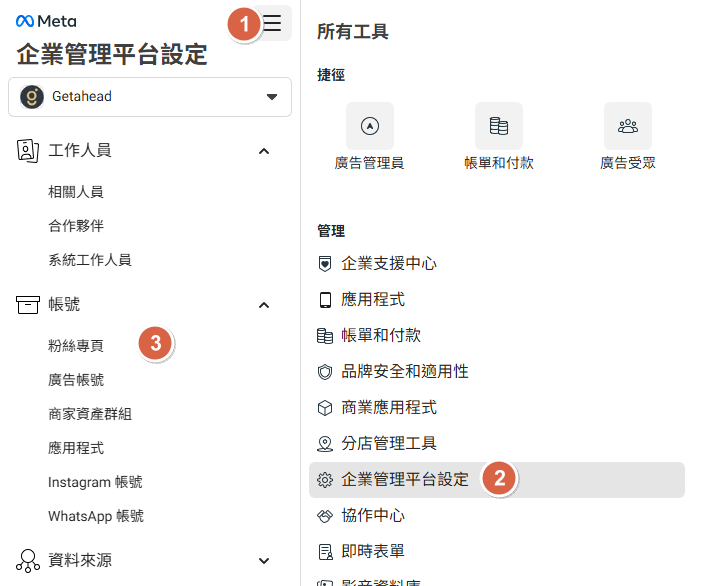 - 到企業管理平台 https://business.facebook.com/settings > 左下角「設定」